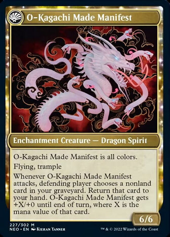O-Kagachi Made Manifest is all colors. Flying, trample Whenever O-Kagachi Made Manifest attacks, defending player chooses a nonland card in your graveyard. Return that card to your hand. O-Kagachi Made Manifest gets +X/+0 until end of turn, where X is the mana value of that card.